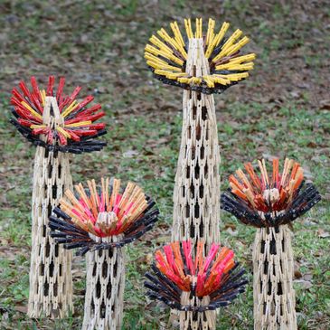 Summer Flos. 2025. 10" diameter x 7" height. Table top sculptures. Wood clothespins, galvanized wire, wood stain and latex paint. Total available: 3.